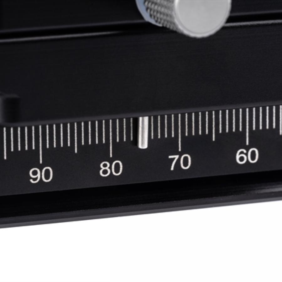 Le rail de mise au point macro NiSi NM-180 est un outil indispensable pour des prises de vue macro de haute qualité. Le rail de réglage a une "fente" compatible Arca pour le montage d'un support de trépied d'objectif ou d'une plaque de dégagement rapide compatible Arca. La pince de montage sur le rail peut être tournée à 360 degrés, de sorte que la direction de la caméra peut être modifiée sans avoir à retirer la plaque de la pince. La plage de réglage du rail de mise au point macro NiSi est de 160 mm, tandis que la taille de la pince est de 180 mm, ce qui permet de déplacer la caméra au maximum. La longueur du rail est ajustée par un bouton à vis rabattable, ce qui facilite le glissement de la caméra vers l'avant/l'arrière. Une plaque à dégagement rapide plus longue est également incluse, conçue spécifiquement pour les téléobjectifs.